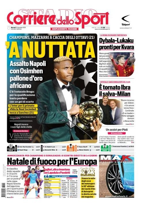 Il Corriere dello Sport, nell'edizione campana, apre con "'A nuttata". Champions, Mazzarri a caccia degli ottavi (21). Assalto Napoli con Osimhen pallone d'oro africano. C'è l'ostacolo Braga: per la qualificazione basta perdere con un gol di scarto. L'Inter per il primato sfida la Real Sociedad: tocca a Sanchez (21). Poi "Dybala-Lukaku, pronti per Kvara", "E' tornato Ibra il salva-Milan". In basso, un focus sulla Serie A "Natale di fuoco per l'Europa".