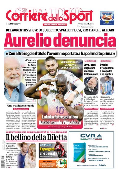 Il Corriere dello Sport, nell'edizione campana, apre con le parole pronunciate dal presidente azzurro Aurelio De Laurentiis a margine del "Premio Bearzot" vinto da Luciano Spalletti: "Aurelio denuncia: "Con altre regole il titolo l'avremmo portato a Napoli molto prima". De Laurentiis show: lo scudetto, Spalletti, Osi, Kim e anche Allegri. "Per avere Luciano ho fatto dei depistaggi. Resterà qui". E il tecnico avvisa i suoi: "Occasione unica, non possiamo perderla".