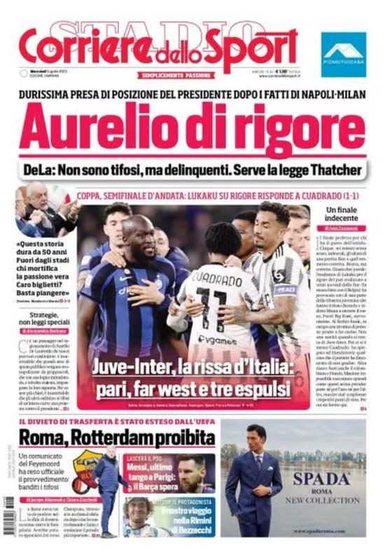 Il Corriere dello Sport, nell'edizione campana, apre con le parole del presidente azzurro Aurelio De Laurentiis dopo i disordini avvenuti al Maradona nel corso del match contro il Milan: "Aurelio di rigore. Durissima presa di posizione del presidente dopo i fatti di Napoli-Milan. DeLa: "Non sono tifosi, ma delinquenti. Serve la legge Thatcher". "Questa storia dura da 50 anni. Fuori dagli stadi chi mortifica la passione vera. Caro biglietti? Basta piangere".
