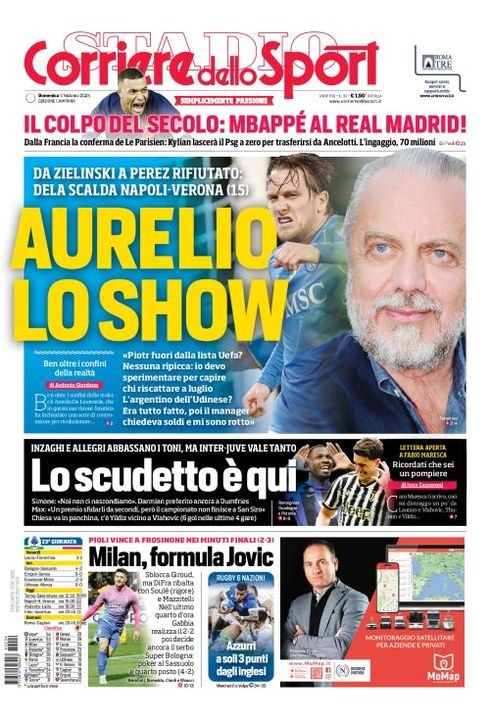 Il Corriere dello Sport, nell'edizione campana, apre con "Aurelio lo show". Da Zielinski a Perez rifiutato, De Laurentiis scalda Napoli-Verona (15): "Piotr fuori dalla lista Uefa? Nessuna ripicca: io devo sperimentare per capire chi riscattare a luglio. L'argentino dell'Udinese? Era tutto fatto, poi il manager chiedeva soldi e mi sono rotto". Spazio, anche a Inter-Juventus "lo scudetto è qui" e al colpo del secolo "Mbappè al Real Madrid". In basso, la vittoria del Milan contro il Frosinone con Jovic e il rugby sei nazioni "Azzurri a soli 3 punti dagli inglesi". Infine, il programma e la classifica della 23esima giornata.