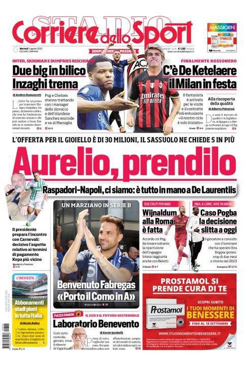 Il Corriere dello Sport, nell'edizione campana, apre con "Aurelio, prendilo". Raspadori-Napoli, ci siamo: è tutto in mano a De Laurentiis. L'offerta per il gioiello è di 30 milioni, il Sassuolo ne chiede 5 in più. Il presidente prepara l'incontro con Carnevali: decisivo l'aspetto relativo ai termini di pagamento. Kepa più vicino.