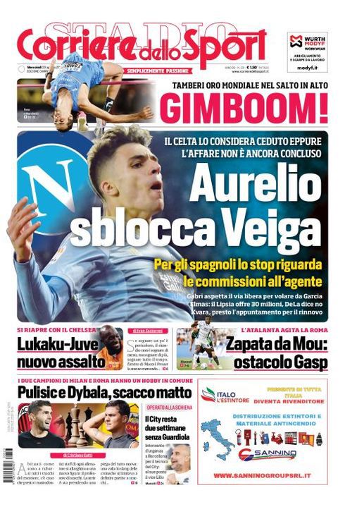 Il Corriere dello Sport, nell'edizione campana, apre con la trattativa tra Napoli e Celta Vigo per Gabri Veiga: "Aurelio sblocca Veiga. Per gli spagnoli lo stop riguarda le commissioni all'agente. Gabri aspetta il via libera per volare da Garcia. Il Celta lo considera ceduto eppure l'affare non è ancora concluso. Elmas, il Lipsia offre 30 milioni, ADL dice no. Kvara, presto l'appuntamento per il rinnovo".