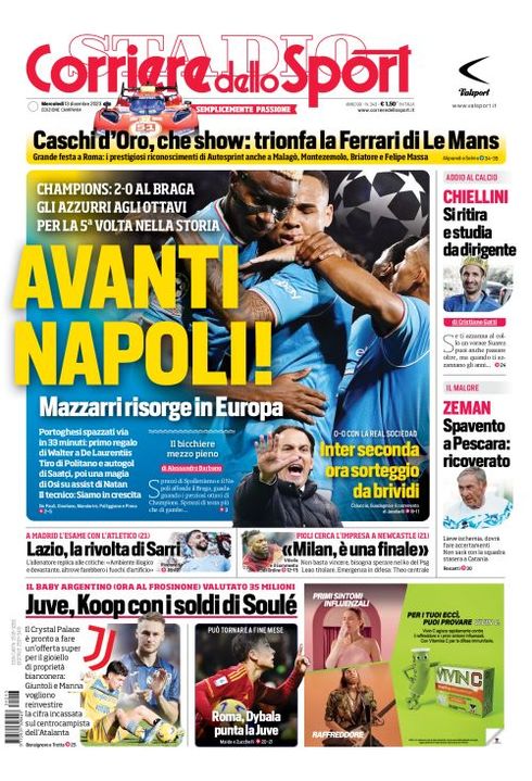 Il Corriere dello Sport, nell'edizione campana, apre parlando della vittoria in Champions del Napoli contro il Braga che è valsa il passaggio agli ottavi di finale: "Avanti Napoli! Mazzarri risorge in Europa. Champions: 2-0 al Braga. Gli azzurri agli ottavi per la quinta volta nella storia. Portoghesi spazzati via in 33 minuti. Primo regalo di Walter a De Laurentiis. Tiro di Politano e autogol di Saatci, poi una magia di Osi su assist di Natan. Il tecnico: "Siamo in crescita".