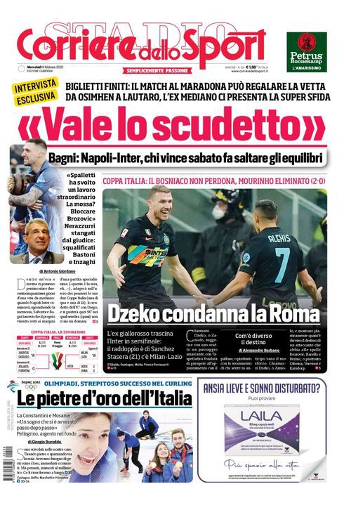Il Corriere dello Sport, nell'edizione campana, apre con l'intervista all'ex caentrocampista azzurro Salvatore Bagni in vista del big match tra Napoli ed Inter: "Biglietti finiti: il match al Maradona può regalare la vetta. Da Osimhen a Lautaro, l'ex mediano ci presenta la super sfida: "Napoli-Inter vale lo scudetto, chi vince sabato fa saltare gli equilibri".