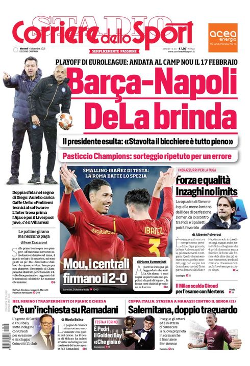 Il Corriere dello Sport, edizione Campania, dedica la prima pagina al sorteggio del Napoli in Europa League che ha accoppiato gli azzurri con il Barcellona: "Barca-Napoli DeLa brinda. Playoff di Euroleague: andata al Camp Nou il 17 febbraio. Il presidente esulta: "Stavolta il bicchiere è tutto pieno". C'è spazio anche al sorteggio di Champions: "Pasticcio Champions: sorteggio ripetuto per un errore".