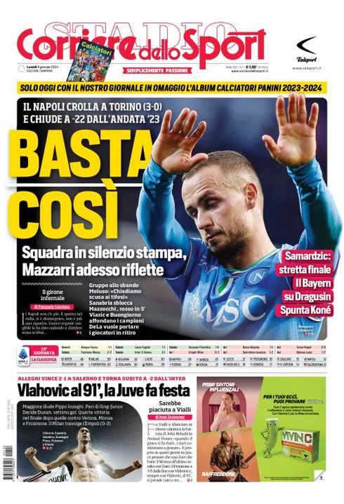 Il Corriere dello Sport, edizione Campania, dedica spazio in prima pagina al Napoli e alla sconfitta contro il Torino: "Basta così. Squadra in silenzio stampa, Mazzarri adesso riflette. Il Napoli crolla a Torino (3-0) e chiude a -22 dall'andata '23".