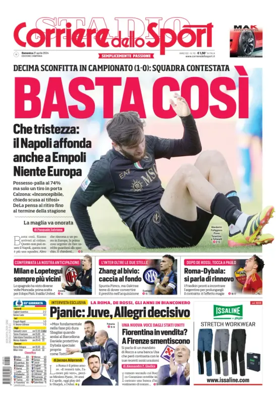 Il Corriere dello Sport, nell'edizione campana, apre con "Basta così". Decima sconfitta in campionato (1-0): squadra contestata. Che tristezza: il Napoli affonda anche a Empoli. Niente Europa. Possesso palla al 74%, ma solo un tiro in porta. Calzona: "Inconcepibile, chiedo scusa ai tifosi". De Laurentiis pensa al ritiro fino al termine della stagione. Spazio anche a "Milan e Lopetegui sempre più vicini". Poi, Inter con "Zhang al bivio: caccia al fondo" e "Roma-Dybala, si parla di rinnovo". In basso, le parole di Miralem Pjanic: "Juve, Allegri decisivo" e "Fiorentina in vendita? A Firenze smentiscono". Infine, il programma della 33esima giornata di Serie A e la classifica.