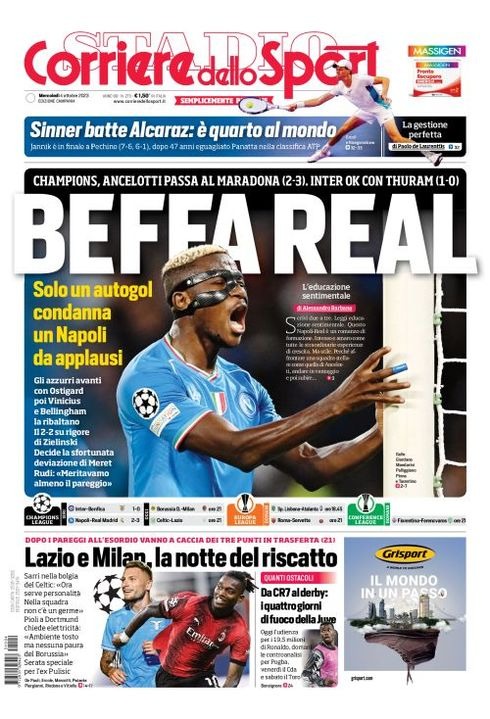 Il Corriere dello Sport, nell'edizione campana, apre con la sconfitta del Napoli in Champions League "Beffa Real". Champions, Ancelotti passa al Maradona (2-3). Inter ok con Thuram (1-0). Solo un autogol condanna un Napoli da applausi. Gli azzurri avanti con Ostigard, poi Vinicius e Bellingham la ribaltano. Il 2-2 su rigore di Zielinski. Decide la sfortunata deviazione di Meret. Rudi Garcia: "Meritavamo almeno il pareggio". In basso, i match di Lazio e Milan in Champions League e spazio anche alla Juventus "Da Cr7 al derby: i quattro giorni di fuoco della Juve".