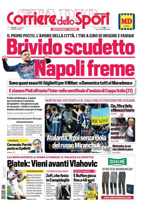 Il Corriere dello Sport, nell'edizione campana, apre con gli azzurri: "Brivido scudetto, Napoli freme". Sono quasi esauriti i biglietti per il Milan: "Domenica tutti al Maradona". Il primo posto, l'amore della città, i tiri a giro di Insigne e Fabian. E stasera Pioli affronta l'Inter nella semifinale d'andata di Coppa Italia.