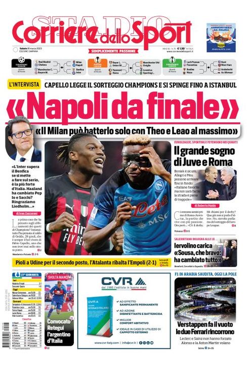 Il Corriere dello Sport, nell'edizione campana, apre con le parole dell'ex allenatore Fabio Capello sul derby italiano in Champions tra Milan e Napoli: "Napoli da finale. Il Milan può batterlo solo con Theo e Leao al massimo". Capello legge il sorteggio Champions e si spinge fino a Istanbul. "L'Inter supera il Benfica se si mette a fare sul serio, è la più forte d'Italia. Haaland ha cambiato Pep. Io e Sacchi? Ringraziamo Liedholm...".