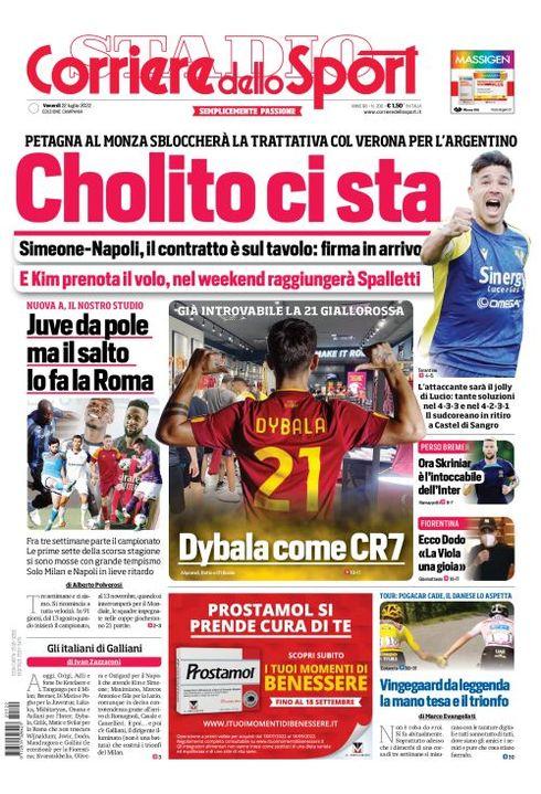 Il Corriere dello Sport, edizione Campania, dedica spazio in prima pagina al calciomercato del Napoli: "Cholito ci sta. Simeone-Napoli, il contratto è sul tavolo: firma in arrivo. E Kim prenota il volo, nel weekend raggiungerà Spalletti". C'è spazio anche per Dybala alla Roma: "Dybala come CR7, già introvabile la 21 giallorossa" e per l'Inter: "Ora Skriniar è l'intoccabile".