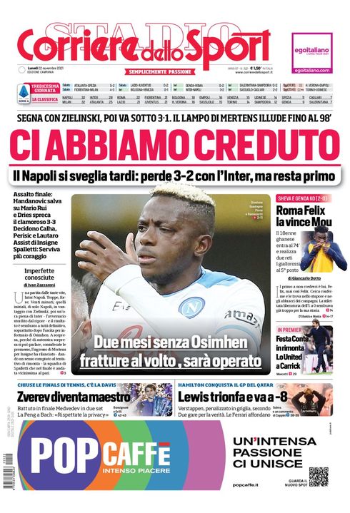 Il Corriere dello Sport, edizione Campania, si sofferma sulla sfida tra Inter e Napoli, conclusasi 3-2 per i nerazzurri, titolando: "Ci abbiamo creduto". "Il Napoli si sveglia tardi: perde 3-2 con l'Inter, ma resta primo.Segna con Zielinski, poi va sotto 3-1. Il lampo di Mertens illude fino al 98'". C'è spazio anche per Osimhen in prima pagina: "Due mesi senza Osimhen, fratture al volto, sarà operato"
