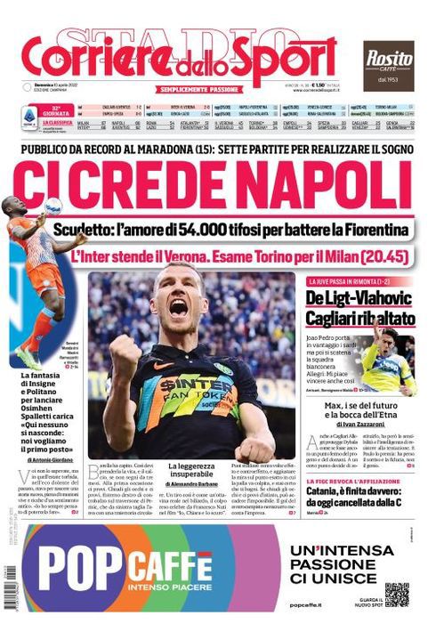 Il Corriere dello Sport, nell'edizione campana, apre con la sfida tra Napoli e Fiorentina ed il gran numero di spettatori atteso al Diego Armando Maradona: "Ci crede Napoli. Pubblico da record al Maradona: sette partite per realizzare il sogno. Scudetto: l'amore di 54.000 tifosi per battere la Fiorentina".