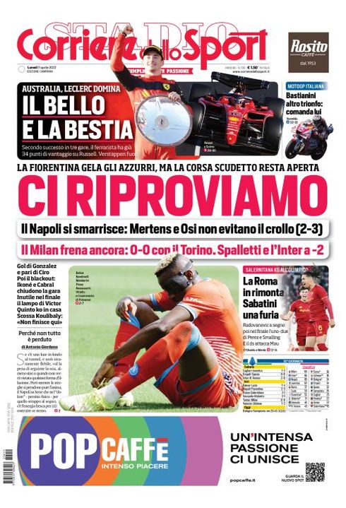 Il Corriere dello Sport, edizione Campania, dedica spazio in prima pagina alla sconfitta del Napoli, in casa, contro la Fiorentina: "Ci riproviamo. La Fiorentina gela gli azzurri, ma la corsa scudetto resta aperta. Il Napoli si smarrisce: Mertens e Osi non evitano il crollo (2-3)". C'è spazio anche per le altre sfide: "Il Milan frena ancora: 0-0 con il Torino. Spalletti e l'Inter a -2" e per la vittoria della Ferrari di Leclerc in Australia: "Il bello e la bestia. Australia, Leclerc domina".