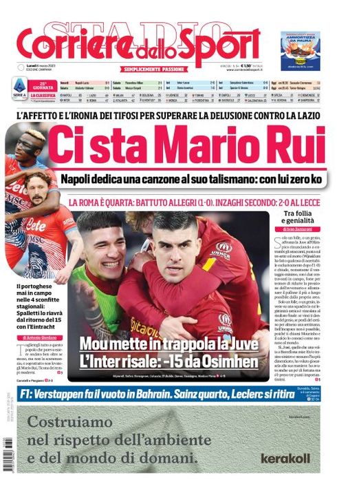 Il Corriere dello Sport, edizione Campania, ha dedicato spazio in prima pagina al Napoli: "Ci sta Mario Rui. L'affetto e l'ironia dei tifosi per superare la delusione contro la Lazio. Napoli dedica una canzone al suo talismano: con lui zero ko". C'è spazio anche per la vittoria della Roma sulla Juventus: "Mou mette in trappola la Juve. L'Inter risale: -15 da Osimhen".