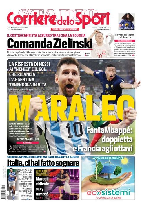 Il Corriere dello Sport, edizione Campania, ha dedicato spazio in prima pagina ai Mondiali e alla vittoria dell'Argentina: "MaraLeo. La risposta di Messi ai "nemici" è il gol che rilancia l'Argentina tenendola in vita". C'è spazio anche per la Francia: "FantaMbappé: doppietta e Francia agli ottavi" e per la Polonia, trascinata da Zielinski: "Comanda Zielinski. Il centrocampista azzurro trascina la Polonia".