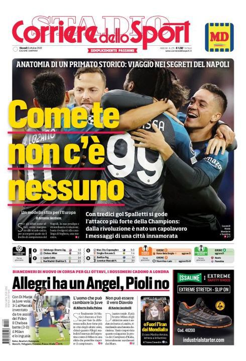 Il Corriere dello Sport, edizione Campania, ha dedicato spazio in prima pagina al Napoli: "Come te non c'è nessuno. Anatomia di un primato storico: viaggio nei segreti del Napoli. Con tredici gol Spalletti si gode l'attacco più forte della Champions: dalla rivoluzione è nato un capolavoro. I messaggi di una città innamorata".