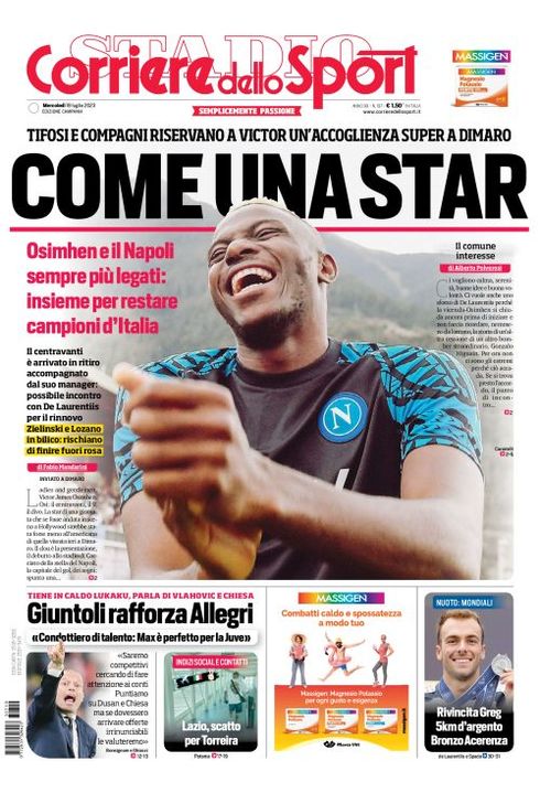 Il Corriere dello Sport, nell'edizione campana, apre parlando dell'arrivo di Victor Osimhen nel ritiro del Napoli a Dimaro: "Come una star. Tifosi e compagni riservano a Victor un'accoglienza super a Dimaro. Osimhen e il Napoli sempre più legati: insieme per restare campioni d'Italia. Il centravanti è arrivato in ritiro accompagnato dal suo manager: possibile incontro con De Laurentiis per il rinnovo. Zielinski e Lozano in bilico: rischiano di finire fuori rosa".