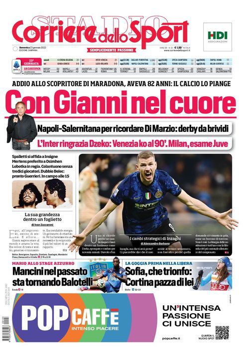 Il Corriere dello Sport, nell'edizione campana, apre con la scomparsa di Gianni Di Marzio: "Con Gianni nel cuore". Addio allo scopritore di Maradona, aveva 82 anni: il calcio lo piange. Napoli-Salernitana per ricordare Di Marzio: derby da brividi.