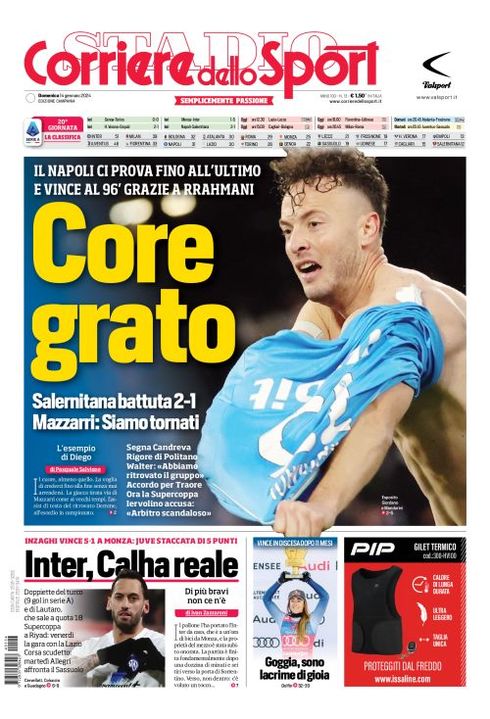 Il Corriere dello Sport, nell'edizione campana, apre parlando del successo ottenuto nel finale dal Napoli nel derby contro la Salernitana al Maradona: "Core grato. Il Napoli ci prova fino all'ultimo e vince al 96' grazie a Rrahmani. Salernitana battuta 2-1, Mazzarri: "Siamo tornati". Segna Candreva. Rigore di Politano. Walter: "Abbiamo ritrovato il gruppo". Accordo per Traorè. Ora la Supercoppa. Iervolino accusa: "Arbitro scandaloso".