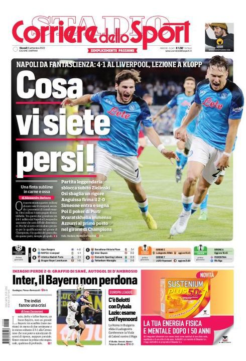 Il Corriere dello Sport, edizione Campania, dedica spazio in prima pagina al Napoli: "Cosa vi siete persi! Napoli da fantascienza: 4-1 al Liverpool, lezione a Klopp. Partita leggendaria: sblocca subito Zielinski, Osi sbaglia un rigore, Anguissa firma il 2-0, Simeone entra e segna, poi il poker di Piotr. Kvaratskhelia immenso. Azzurri al primo posto nel girone di Champions".