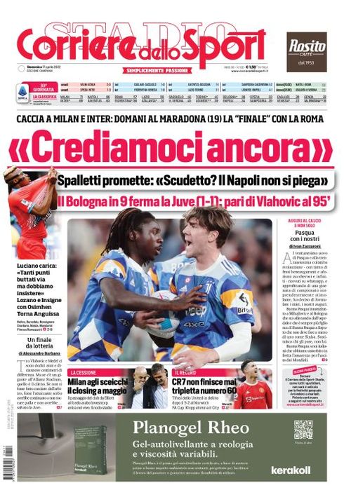 Il Corriere dello Sport, nell'edizione campana, apre con il match degli azzurri: "crediamoci ancora". Caccia a Milan e Inter: al Maradona (19) la "finale" con la Roma. Spalletti promette: "Scudetto? Il Napoli non si piega".