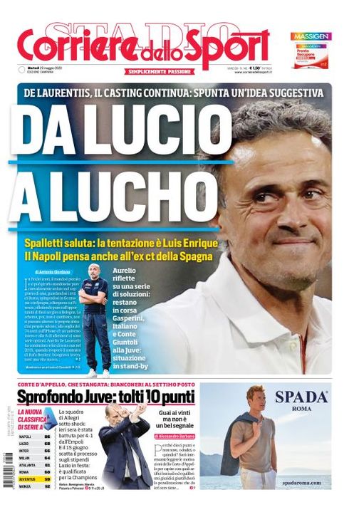 Il Corriere dello Sport, nell'edizione campana, apre parlando del possibile nuovo allenatore del Napoli: "Da Lucio a Lucho. De Laurentiis, il casting continua: spunta un'idea suggestiva. Spalletti saluta: la tentazione è Luis Enrique. Il Napoli pensa anche all'ex c.t. della Spagna. Aurelio riflette su una serie di soluzioni: restano in corsa Gasperini, Italiano e Conte. Giuntoli alla Juve: situazione in stand-by".