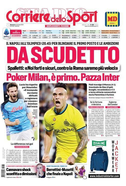 Il Corriere dello Sport, nell'edizione campana, apre con "Da Scudetto". Il Napoli all'Olimpico (20:45) per blindare il primo posto e le ambizioni. Spalletti: "Noi forti e sicuri, contro la Roma saremo più veloci". Lucio ha rispetto per Mourinho: "E' tremendo ma siamo abituati a ragionare per vincere". Osimhen dall'inizio.