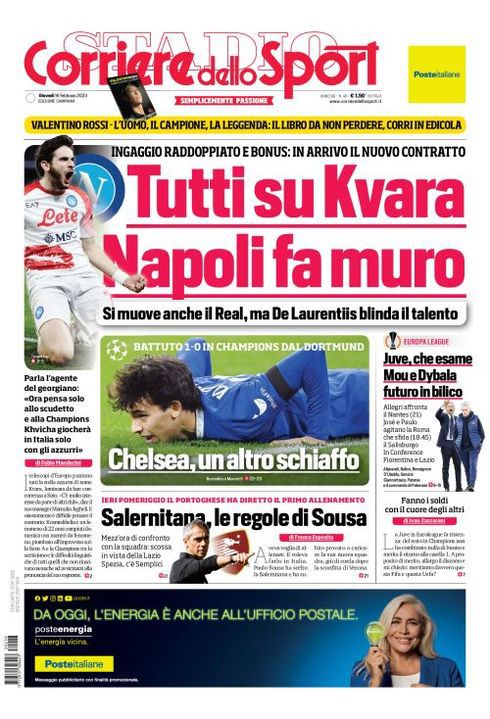 Il Corriere dello Sport, edizione Campania, dedica spazio a Khvicha Kvaratskhelia, fantasista del Napoli: "Tutti su Kvara, il Napoli fa muro. Ingaggio raddoppiato e bonus: in arrivo il nuovo contratto. Si muove anche il Real, ma De Laurentiis blinda il talento".