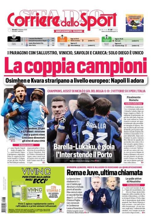 Il Corriere dello Sport, edizione Campania, dedica spazio in prima pagina al Napoli: "La coppia campioni. Osimhen e Kvara straripano a livello europeo: Napoli li adora. I paragoni con Sallustro, Vinicio, Salvoldi e Careca: solo Diego è unico". C'è spazio anche per la vittoria dell'Inter in Champions League: "Barella-Lukaku, è gioia, l'Inter stende il Porto".
