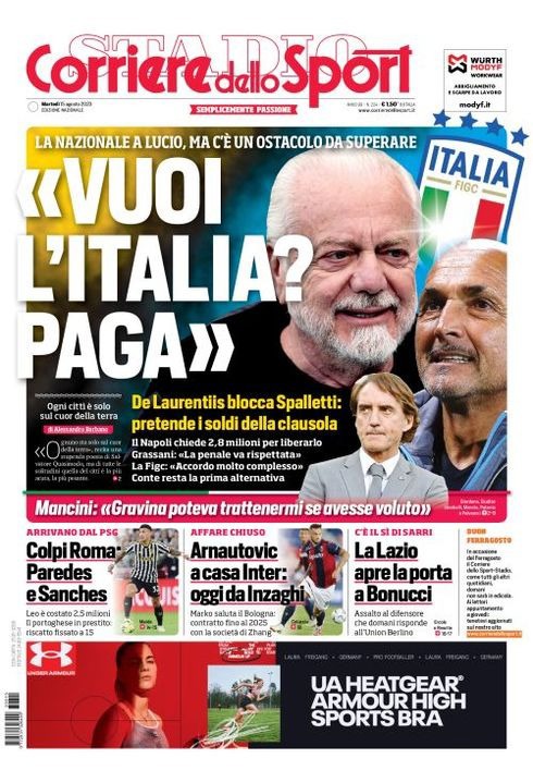 Il Corriere dello Sport, nell'edizione campana, apre con "Vuoi l'Italia? Paga". La Nazionale a Lucio, ma c'è un ostacolo da superare. De Laurentiis blocca Spalletti: pretende i soldi della clausola. Il Napoli chiede 2,8 milioni per liberarlo. Grassani: "La penale va rispettata". La FIGC: "Accordo molto complesso". Conte resta la prima alternativa. Spazio anche all'intervista a Roberto Mancini, dopo le dimissioni: "Gravina poteva trattenermi se avesse voluto". In basso, il mercato di Roma (Paredes e Sanches), Inter (Arnautovic) e Lazio (Bonucci).