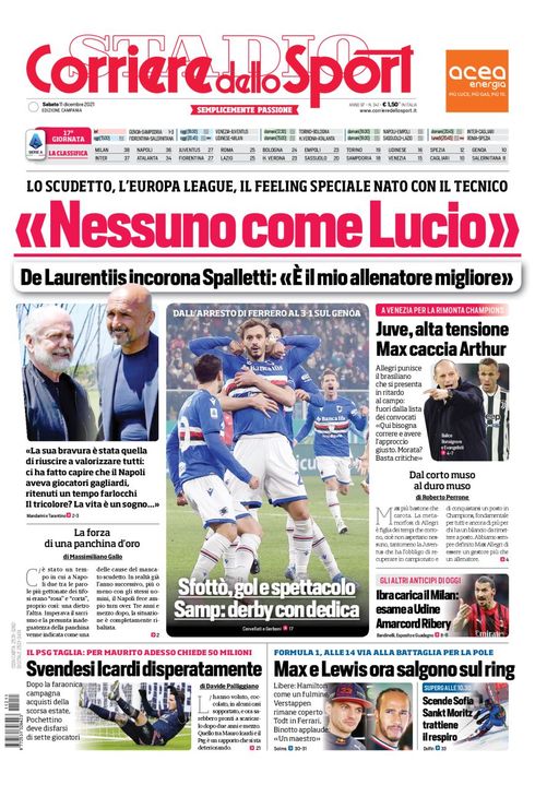 Il Corriere dello Sport, nell'edizione campana, apre con le parole del presidente azzurro Aurelio De Laurentiis su Luciano Spalletti: "Nessuno come Lucio", De Laurentiis incorona Spalletti: "E' il mio allenatore migliore". Lo Scudetto, l'Europa League, il feeling speciale nato con il tecnico".