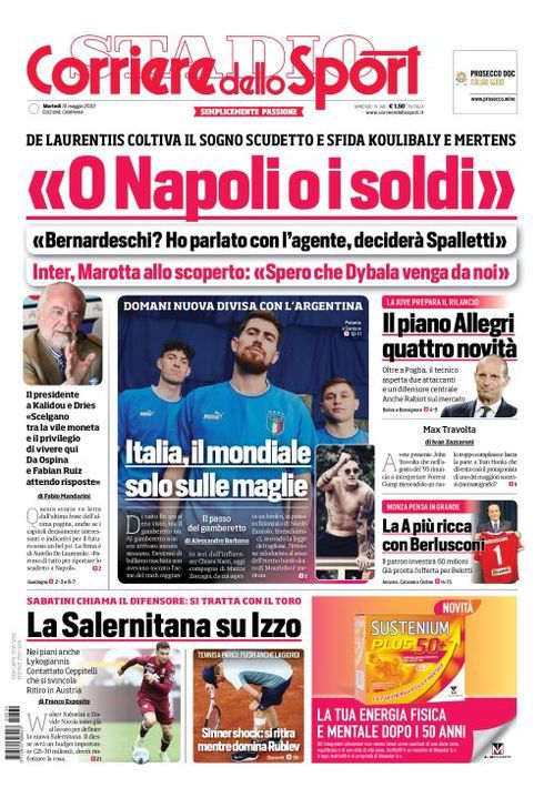 Il Corriere dello Sport, nell'edizione campana, apre con le dichiarazioni del presidente del Napoli. De Laurentiis coltiva il sogno scudetto e sfida Koulibaly e Mertens: "O Napoli o i soldi". "Bernardeschi? Ho parlato con l'agente, deciderà Spalletti". Il presidente a Kalidou e Dries: "Scelgano tra la vile moneta e il privilegio di vivere qui. Da Ospina a Fabian Ruiz attendo risposte".
