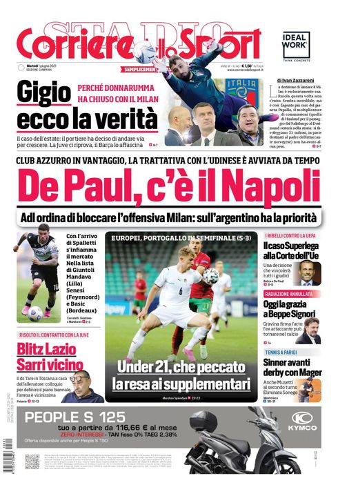 "De Paul, c'è il Napoli", si legge sulla prima pagina del quotidiano Il Corriere dello Sport edizione Campania. "Club azzurro in vantaggio, la trattativa con l'Udinese è avviata da tempo. ADL ordina di bloccare l'offensiva del Milan: sull'argentino ha la priorità. Con l'arrivo di Spalletti si infiamma il mercato. Nella lista di Giuntoli Mandava, Senesi e Basic".