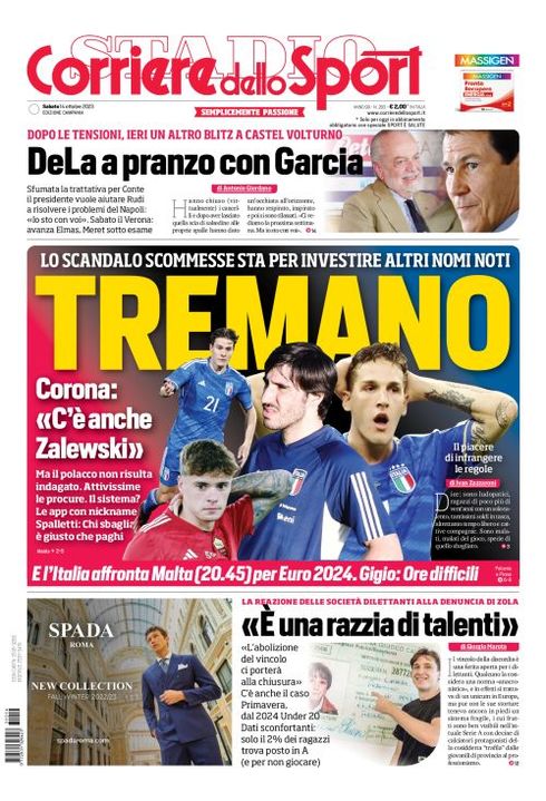 Il Corriere dello Sport, nell'edizione campana, apre parlando del Napoli: "DeLa a pranzo con Garcia. Dopo le tensioni, ieri un altro blitz a Castel Volturno. Sfumata la trattativa per Conte il presidente vuole aiutare Rudi a risolvere i problemi del Napoli. "Io sto con voi". Sabato il Verona: avanza Elmas. Meret sotto esame".