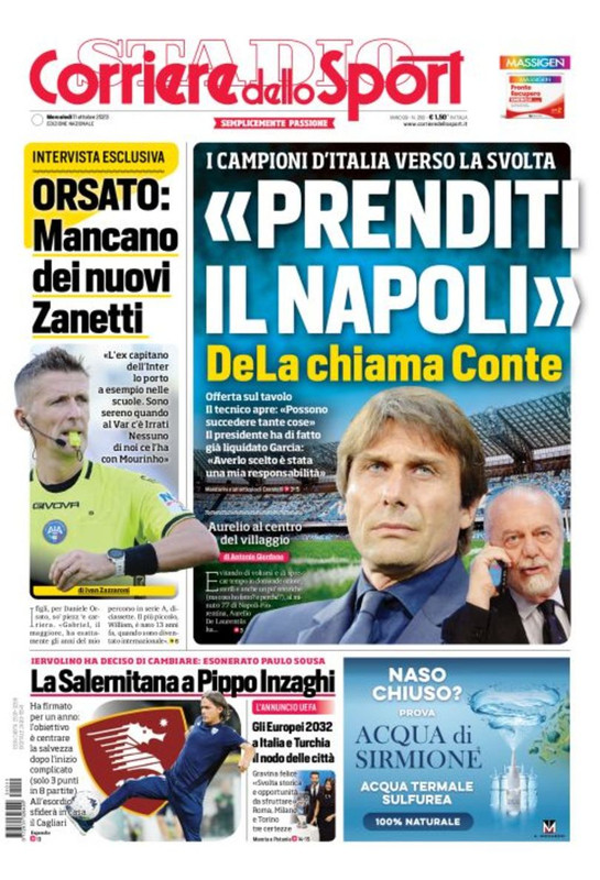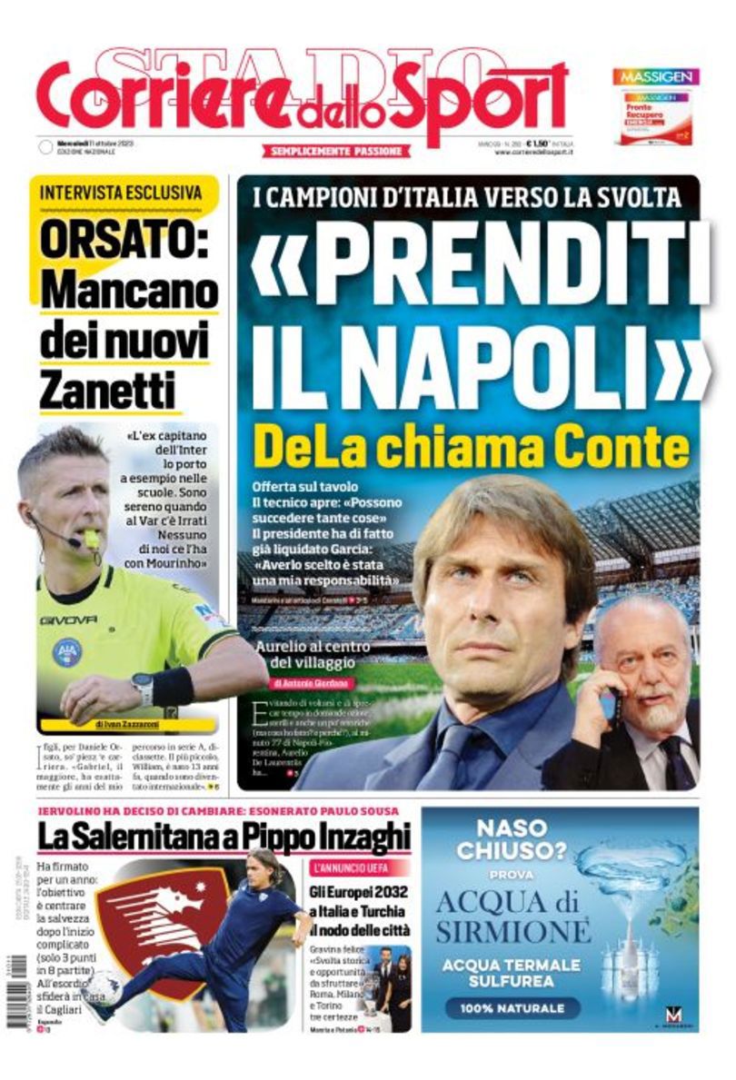 Il Corriere dello Sport, nell'edizione campana, apre parlando del possibile approdo di Antonio Conte al Napoli in caso di esonero di Rudi Garcia: "DeLa chiama Conte: "Prenditi il Napoli". I campioni d'Italia verso la svolta. Offerta sul tavolo. Il tecnico apre: "Possono succedere tante cose". Il presidente ha di fatto già liquidato Garcia: "Averlo scelto è stata una mia responsabilità".