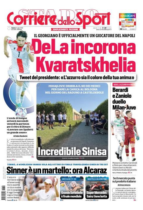 Il Corriere dello Sport, nell'edizione campana, apre con il tweet di benvenuto a Kvaratskhelia da parte del presidente azzurro Aurelio De Laurentiis: "DeLa incorona Kvaratskhelia. Tweet del presidente: "L'azzurro sia il colore della tua anima". Il georgiano è ufficialmente un giocatore del Napoli. L'erede di Insigne arriverà mercoledì: venerdì la partenza per il ritiro di Dimaro: "Lavorare con Spalletti un grande onore".
