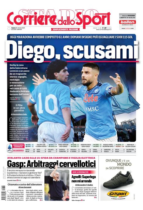 NAPOLI - Il Corriere dello Sport, nell'edizione campana, apre con un omaggio a Diego Armando Maradona che oggi avrebbe compiuto 61 anni e con il capitano azzurro Lorenzo Insigne che nella prossima gara di campionato potrà raggiungere il numero di gol nel Napoli dell'ex numero 10: "Diego, scusami. Oggi Maradona avrebbe compiuto 61 anni: domani Insigne può eguagliare i suoi 115 gol. Derby in casa della Salernitana, Lorenzo a un passo da un traguardo storico: orgoglio, nostalgia e venerazione per un mito nel cuore di tutti. Zielinski e Politano tornano dall'inizio".