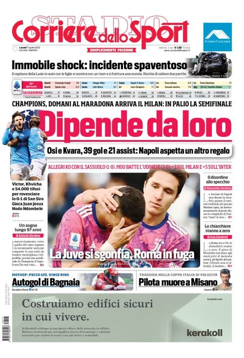 Il Corriere dello Sport, edizione Campania, dedica spazio in prima pagina al Napoli: "Dipende da loro. Champions, domani al Maradona arriva il Milan: in palio la semifinale. Osi e Kvara, 39 gol e 21 assist: Napoli aspetta un altro regalo". C'è spazio anche per la Serie A: "La Juve si sgonfia, Roma in fuga".