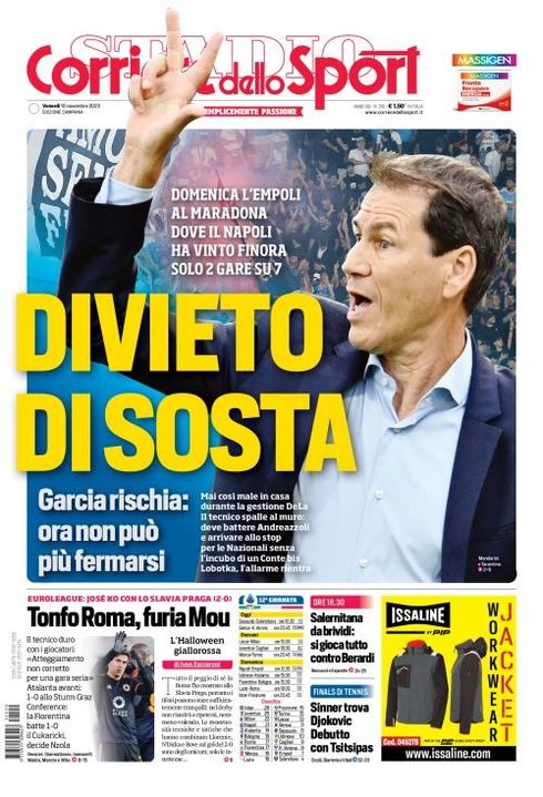 Il Corriere dello Sport, nell'edizione campana, apre con "Divieto di sosta". Garcia rischia: ora non può più fermarsi. Domenica l'Empoli al Maradona, dove il Napoli ha vinto finora solo 2 gare su 7. Mai così male in casa durante la gestione De Laurentiis. Il tecnico spalle al muro: deve battere Andreazzoli e arrivare allo stop per le Nazionali senza l'incubo di un Conte bis. Lobotka, l'allarme rientra. In basso, spazio alla sconfitta della Roma in Europa League "Tonfo Roma, furia Mou". Poi "Salernitana da brividi: si gioca tutto contro Berardi" e "Sinner trova Djokovic. Debutto con Tsitsipas".