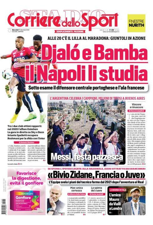 Il Corriere dello Sport, nell'edizione campana, apre con le mosse di mercato del Napoli: "Djalò e Bamba, il Napoli li studia. Alle 20 c'è il Lilla al Maradona: Giuntoli in azione. Sotto esame il difensore centrale portoghese e l'ala francese. Tra i due club ottimi rapporti: nel 2020 l'affare Osimhen. La gara in diretta su Sky e DAZN. Intanto Spalletti recupera Rrahmani per la sfida con l'Inter".