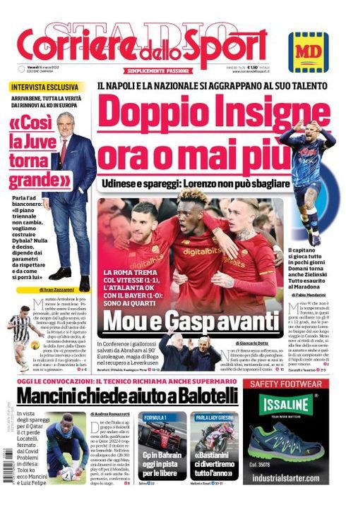 Il Corriere dello Sport, nell'edizione campana, apre con "Doppio Insigne, ora o mai più". Il Napoli e la Nazionale si aggrappano al suo talento. Udinese e spareggi: Lorenzo non può sbagliare.