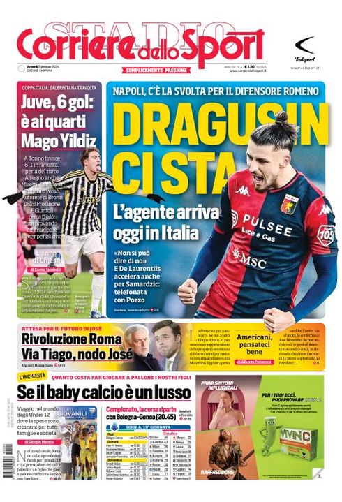 Il Corriere dello Sport, nell'edizione campana, apre con "Dragusin ci sta". Napoli, c'è la svolta per il difensore romeno. L'agente arriva oggi in Italia: "Non si può dire di no". E De Laurentiis accelera anche per Samardzic: telefonata con Pozzo. Spazio alla vittoria della Juventus in Coppa Italia contro la Salernitana "Juve, 6 gol: è ai quarti. Mago Yildiz". Poi, "Rivoluzione Roma. Via Tiago, nodo Josè". In basso, l'inchiesta "Se il baby calcio è un lusso" e il programma della 19esima giornata di Serie A con la classifica.