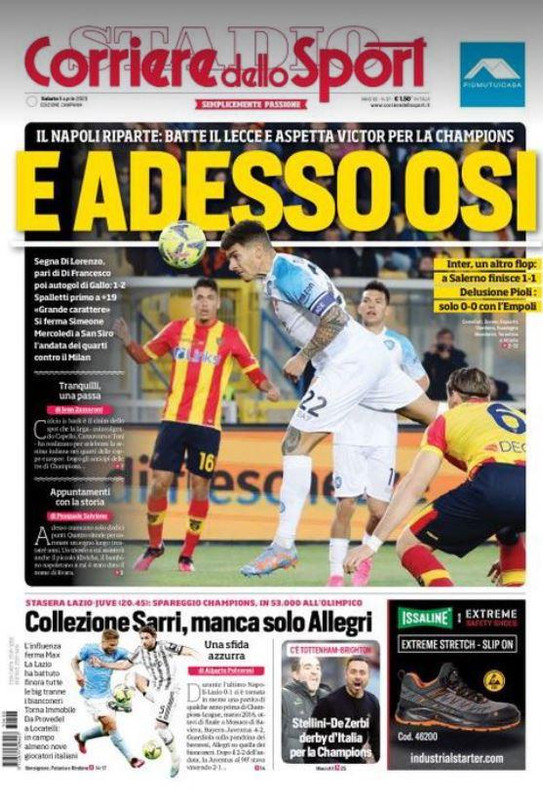 Il Corriere dello Sport, nell'edizione campana, apre parlando della vittoria del Napoli a Lecce e del ritorno in campo dell'azzurro Osimhen nel match di Champions contro il Milan: "E adesso Osi. Il Napoli riparte: batte il Lecce e aspetta Victor per la Champions. Segna Di Lorenzo, pari di Di Francesco, poi autogol di Gallo: 1-2. Spalletti primo a +19: "Grande carattere". Si ferma Simeone. Mercoledì a San Siro l'andata dei quarti contro il Milan".