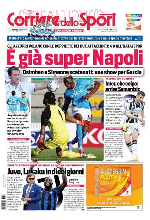 Il Corriere dello Sport, nell'edizione campana, apre con "E' già super Napoli". Gli azzurri volano con le doppiette dei due attaccanti: 4-0 all'Hatayspor. Osimhen e Simeone scatenati: uno show per Garcia. Anguissa in regia: esame superato. Raspadori provato come mezzala. Mercato: si spinge per Lo Celso e Mavropanos.