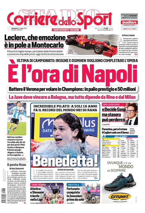 "E' l'ora di Napoli", titola così la prima pagina del quotidiano Il Corriere dello Sport nella sua edizione Campania. "Ultima di campionato: Osimhen e Mertens vogliono completare l'opera. Battere il Verona per volare in Champions: in palio prestigio e 50 milioni. La Juve deve vincere a Bologna, ma tutto dipende da Rino e dal Milan".