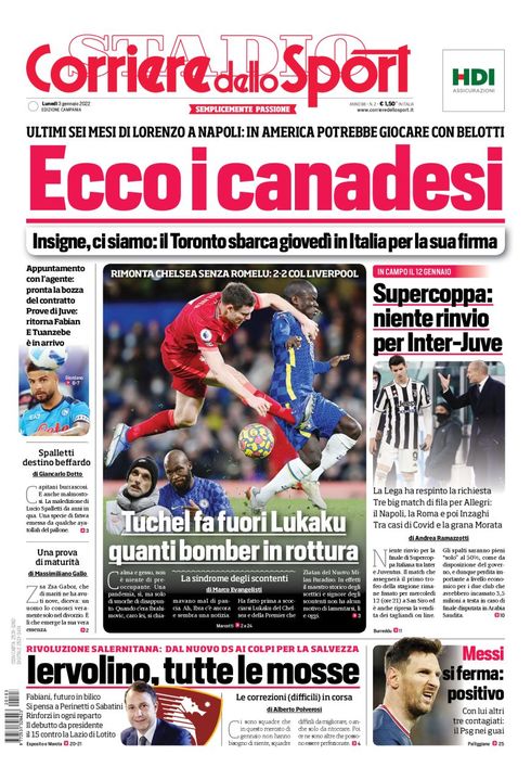 Il Corriere dello Sport, edizione Campania, ha dedicato la prima pagina a Lorenzo Insigne e il Napoli: "Ecco i canadesi. Ultimi sei mesi di Lorenzo a Napoli: in America potrebbe giocare con Belotti. Insigne, ci siamo: il Toronto sbarca giovedì in Italia per la sua firma". C'è anche spazio per la questione legata a Romelu Lukaku: "Tuchel fa fuori Lukaku, quanti bomber in rottura", e la Supercoppa: "Supercoppa: niente rinvio per Inter-Juve".