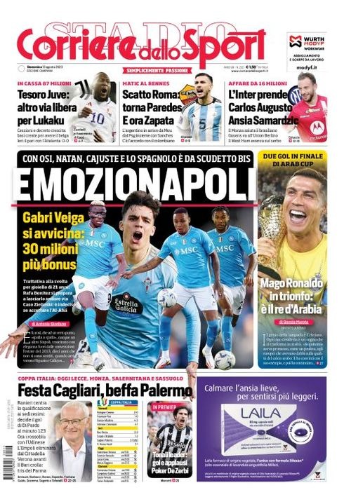 Il Corriere dello Sport, nell'edizione campana, apre con "EmozioNapoli". Gabri Veiga si avvicina: 30 milioni più bonus. Con Osi, Natan, Cajuste e lo spagnolo è da Scudetto bis. Trattativa alla svolta per gioiello di 21 anni. Rafa Benitez si prepara a lasciarlo andare via. Caso Zielinski: è indeciso se accettare l'Al-Ahli.