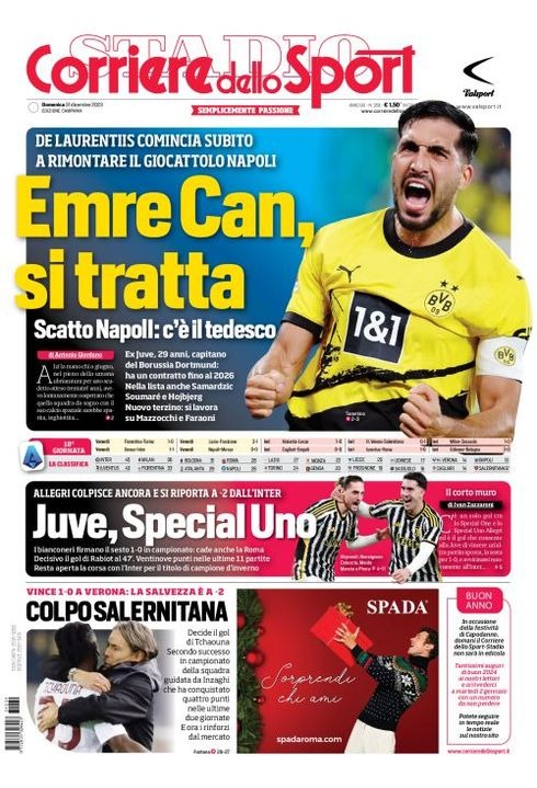 Il Corriere dello Sport, nell'edizione campana, apre con "Emre Can, si tratta". De Laurentiis comincia subito a rimontare il giocattolo Napoli. Scatto Napoli: c'è il tedesco. Ex Juve, 29 anni, capitano del Borussia Dortmund: ha un contratto fino al 2026. Nella lista anche Samardzic, Soumarè e Hijbjerg. Nuovo terzino: si lavora su Mazzocchi e Faraoni. Spazio anche a "Juve, Special Uno", "Colpo Salernitana" e i risultati e la classifica dopo la 18esima giornata di Serie A.