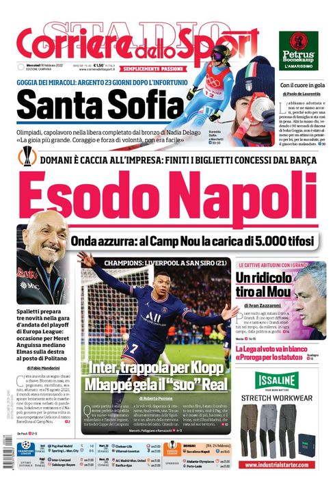 Il Corriere dello Sport, nell'edizione campana, apre con la grande sfida di Europa League tra il Barcellona ed il Napoli al Camp Nou nella quale gli azzurri saranno sostenuti dai tanti tifosi napoletani presenti allo stadio: "Esodo Napoli. Domani è caccia all'impresa: finiti i biglietti concessi dal Barça. Onda azzurra: al Camp Nou la carica di 5.000 tifosi".